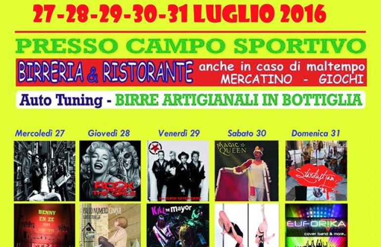 Coniato anche il nome: "Sport a tutta birra 2016", ed andrà in "onda" dal prossimo 27 e fino al 31 Luglio. Previsti nel campo alle spalle degli stand anche vari tornei sportivi, tra tutti, uno di calcio a cinque con squadre che hanno, di solito, un gran seguito. Un torneo da sagra, divertente per chi gioca e chi assiste, ben strutturato, ovviamente, ma che alla fine, per riportare tutto al livello della festa, prevede come premio anche una cena a scelta negli stand.