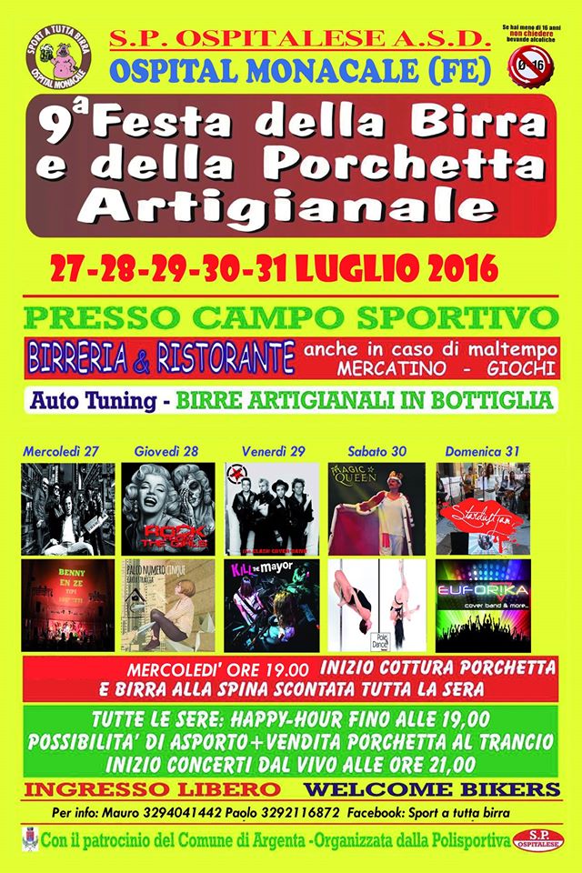 È la nona edizione della Festa della Birra e della Porchetta Artigianale, quella che si tiene nel campo sportivo di Ospital Monacale, nel comune di Argenta (Ferrara), che ha anche concesso il proprio patrocinio. E dire che birra e porchetta potevano sembrare un binomio impossibile da "sposare" ma alla sagra sono caduti tutti i tabù: bevanda e cibo vanno insieme ottimamente, molto di più di quello che si poteva credere. La festa è merito della "Sp Ospitalese", la polisportiva che da questa sagra riceve il sostentamento per le attività di un anno intero, per il calcio e per le tantissime altre che mantengono viva l’identità del paese.